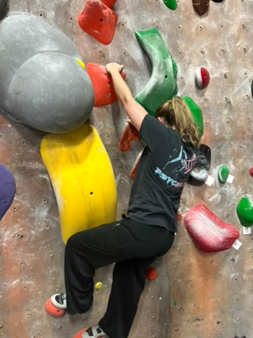 Personally, I struggled with staying in the present before I started bouldering. I had to balance work, school, and my personal life, which often left me feeling overwhelmed and having a constant to do list in my head. After I discovered climbing, the challenge and mental puzzle of each hold helped me stay completely in the present. It allowed me to forget the stressors that had been weighing me down, providing a much-needed mental escape and a powerful sense of accomplishment. Rock climbing forces you think about where to place/position your entire body for the next hold. Focusing on balance, strength, momentum, and placement is like solving a mental puzzle that requires focus and brings you to the moment. While I am climbing, I become so focused, that everything else melts away. It truly transformed my ability to focus and manage stress.